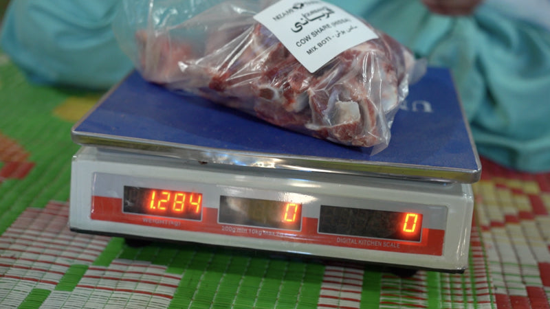 12 to 14 packs of meat are prepared after meat has been completely cleaned and cut in to boti size. (e.g. for Cow Hissa meat is comprised of Mix Boti packs, Boneless Boti packs, Shank Boneless for Nihari along with bones, Flanks for veal mince and Liver).
